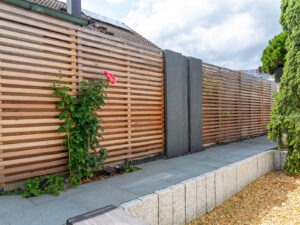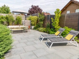 Completely remove the existing paved area, dismantle the existing wooden deck including the wooden cladding, remove and dispose of the existing steel pool, remove the skylight elements, install new L-shaped retaining walls and shape the terrain, remove the granite palisades and steps, loosen the excavation for the pool, install the new pool, install the water feature, carry out paving work on the pool surround and terraces, and install privacy screens.